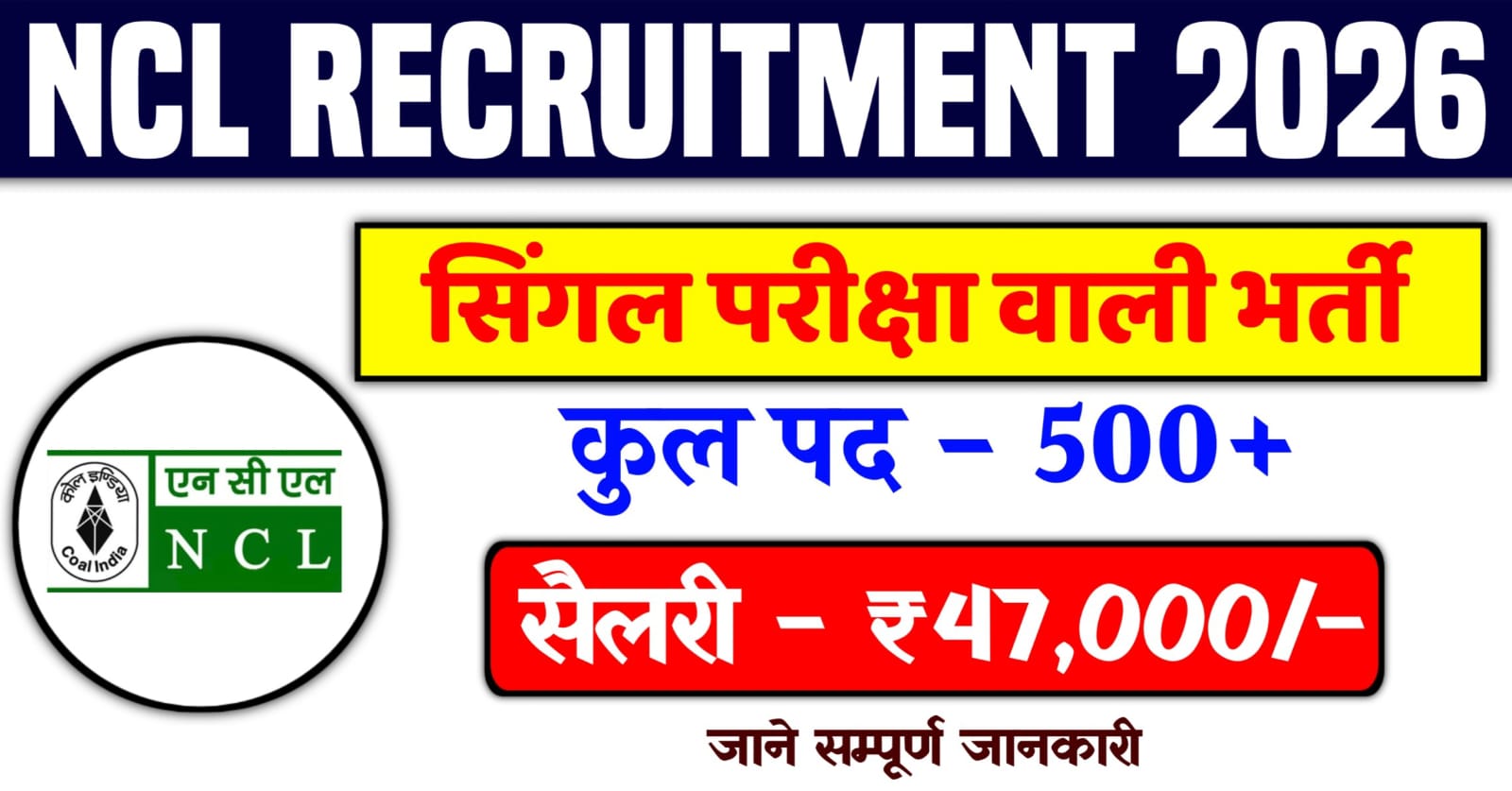 NCL Recruitment 2026:- नॉर्दर्न कोलफील्ड्स में 500 से अधिक पदों पर भर्ती, 10वी 12वी करें आवेदन